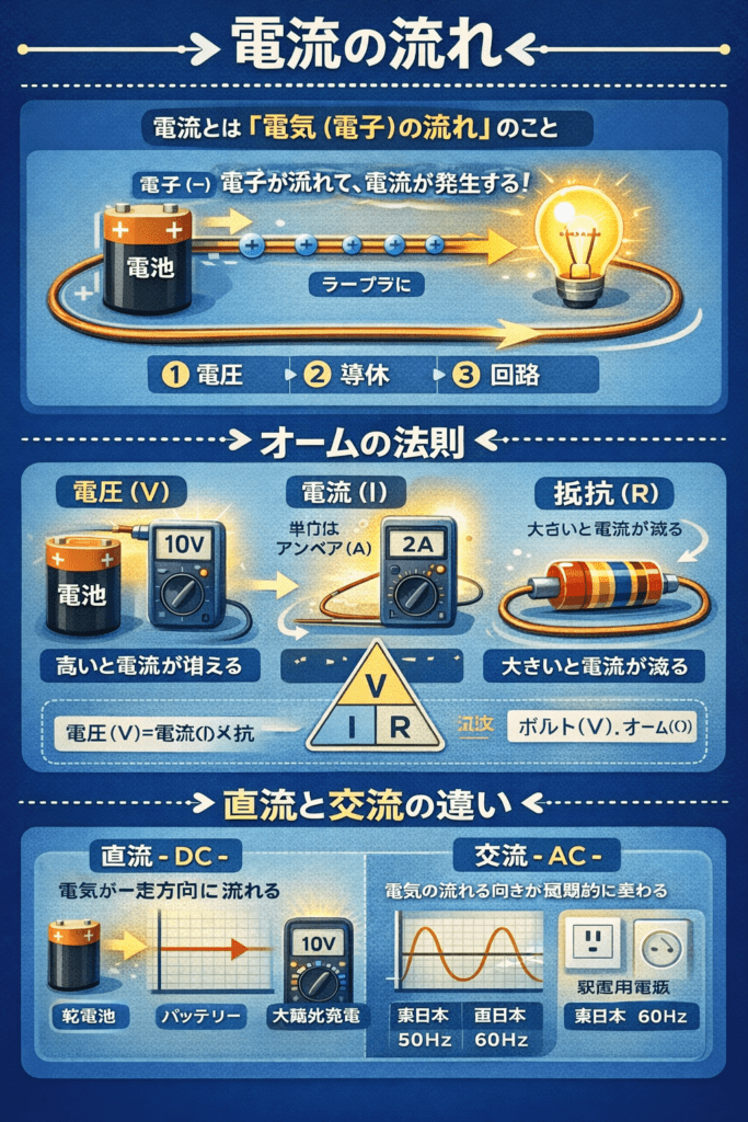 この記事では、電流の正体を 物理学の基本からわかりやすく解説し、電圧や抵抗との関係、電流の種類、歴史まで紹介します。