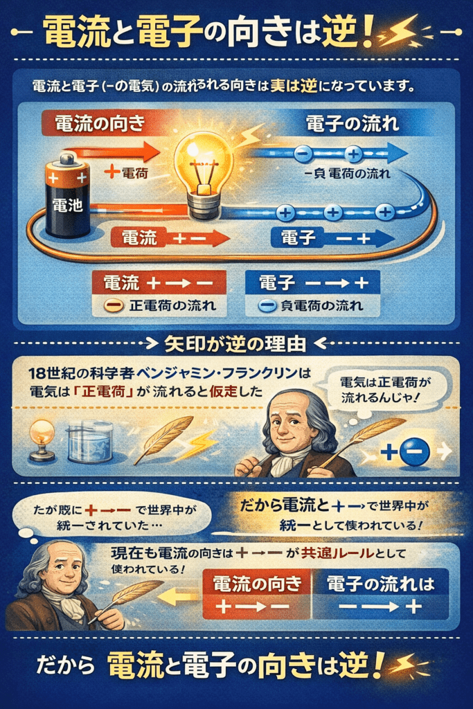 記事の下側に補足として、「電流と電子の流れる向きが実は逆向きな理由について」解説していますので、そちらもご参照ください。