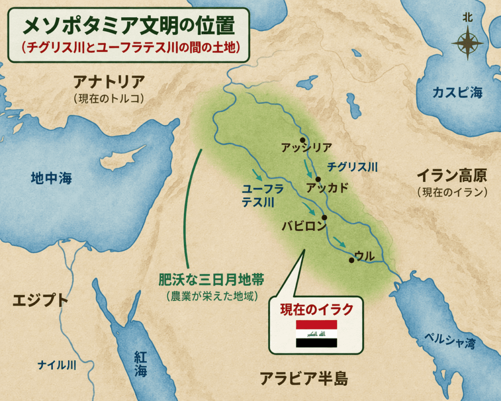 現在のイラク周辺、チグリス川とユーフラテス川の間に生まれたこの文明は、都市・国家・法律・文字・科学といった現代社会の基礎を築きました。
